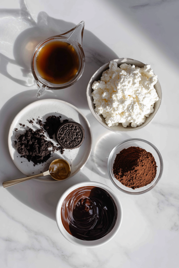 This dessert is truly decadent. It’s satiating, rich, creamy, and comprised of ingredients that you likely already have around your house. So quick, run to your kitchen and if you have the ingredients DO NOT WAIT. I know I’m being dramatic but seriously… why would you wait? All you need is cottage cheese, protein powder (preferably a chocolate or vanilla type flavor), Oreo cookies or a similar substitute like these from Catalina Crunch, maple syrup or honey and dark chocolate (which you could honestly leave off if you don’t already have it and don’t feel like making a run to the store).